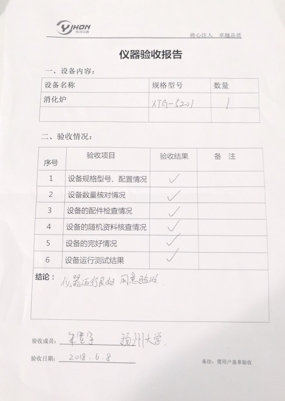 揚(yáng)州大學(xué)近期采購消化爐XTG-5201一臺,祎鴻已于6月完成產(chǎn)品驗(yàn)收。XTG-5201紅外消解儀采用電熱絲復(fù)合真空加熱技術(shù),升溫效率高,溫度均勻性好,可為揚(yáng)州大學(xué)相關(guān)專業(yè)對種子、土壤、植株、飼料、礦石等化學(xué)分析之前的樣品進(jìn)行消解處理。